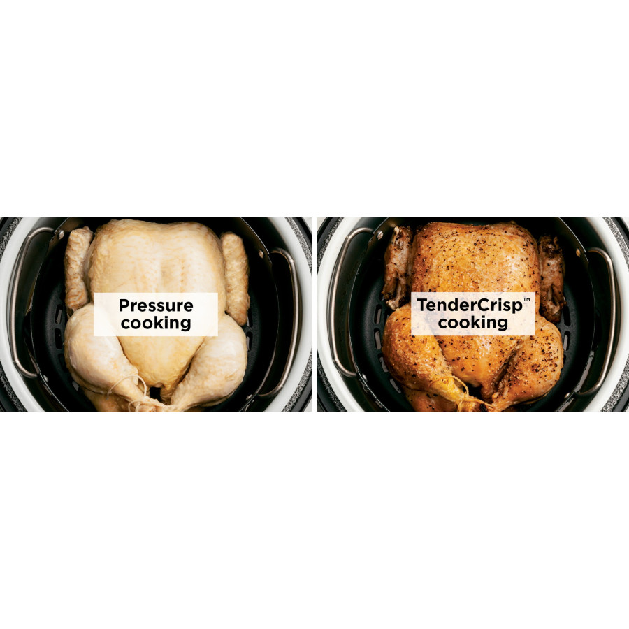 Якщо у вас мало часу, але є бажання поласувати хрусткою курочкою, то вмикайте в мультиварці режим приготування під тиском, аби найшвидше вона обробилася зсередини, а після застосовуйте технологію TenderCrisp від Ninja. Тому ваш обід буде готовий на 70% швидше, та ще й з мінімумом олії. Одна із кришок у комплекті підійде для режиму під тиском, інша для — для TenderCrisp. Скороварка також працює з замороженими продуктами.